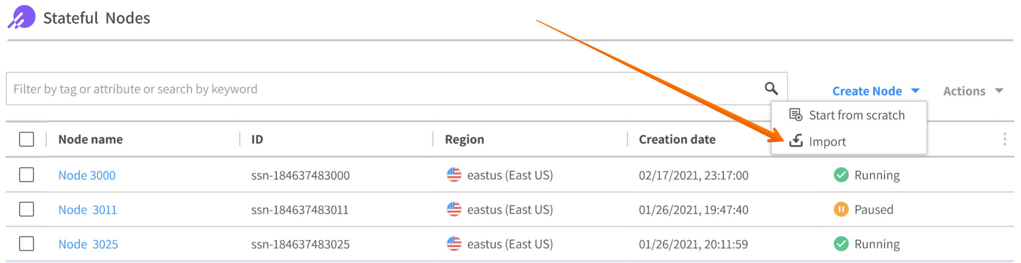 2. On the top right, click Create Node> Import.